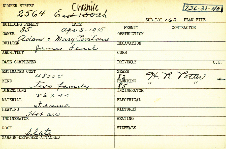 2564 Cheshire Road Shaker Heights, OH 44120 PARCEL ID: 736-31-040 Building Permit Date: 04-08-1915 Plan File Number: 0 Neighborhood: Boulevard Owner: Povilouse, Adam and Mary Builder: Fench, James Estimated Cost: 4800 Kind: Duplex or Two-Family Material: Frame Heating: Hot Air Roof: Slate Card Available: yes |