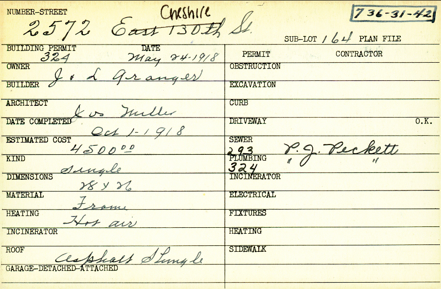 2572 Cheshire Road Shaker Heights, OH 44120 PARCEL ID: 736-31-042 Building Permit Date: 05-24-1918 Plan File Number: 0 Neighborhood: Boulevard Owner: Granger, J. and L. Architect: Miller, Joseph Estimated Cost: 4500 Date Completed: 10-01-1918 Kind: Single, Single Residence or Dwelling Material: Frame Heating: Hot Air Roof: Asphalt Shingles Card Available: yes |