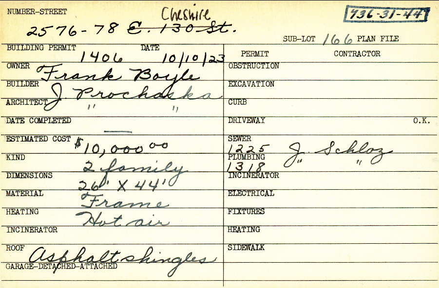 2576 Cheshire Road Shaker Heights, OH 44120 PARCEL ID: 736-31-044 Building Permit Date: 10-10-1923 Plan File Number: 0 Neighborhood: Boulevard Owner: Boyle, Frank Builder: Prochaska, J. Architect: Prochaska, J. Estimated Cost: 10000 Kind: Duplex or Two-Family Material: Frame Heating: Hot Air Roof: Asphalt Shingles Card Available: yes |
