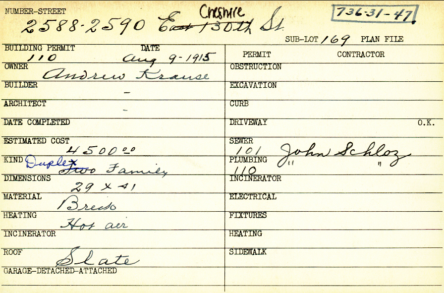 2588 Cheshire Road Shaker Heights, OH 44120 PARCEL ID: 736-31-047 Building Permit Date: 08-09-1915 Plan File Number: 0 Neighborhood: Boulevard Owner: Krause, Andrew Estimated Cost: 4500 Kind: Duplex or Two-Family Material: Brick Heating: Hot Air Roof: Slate Card Available: yes |