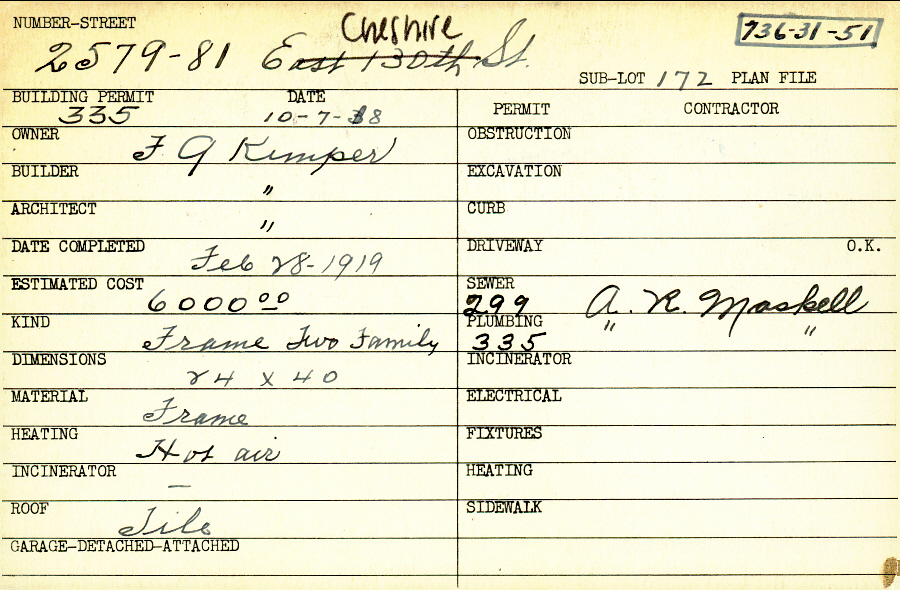 2579 Cheshire Road Shaker Heights, OH 44120 PARCEL ID: 736-31-051 Building Permit Date: 10-07-1918 Plan File Number: 0 Neighborhood: Boulevard Owner: Kimper, F. G. Builder: Kimper, F. G. Architect: Kimper, F. G. Estimated Cost: 6000 Date Completed: 02-28-1919 Kind: Duplex or Two-Family Material: Frame Heating: Hot Air Roof: Tile Card Available: yes |