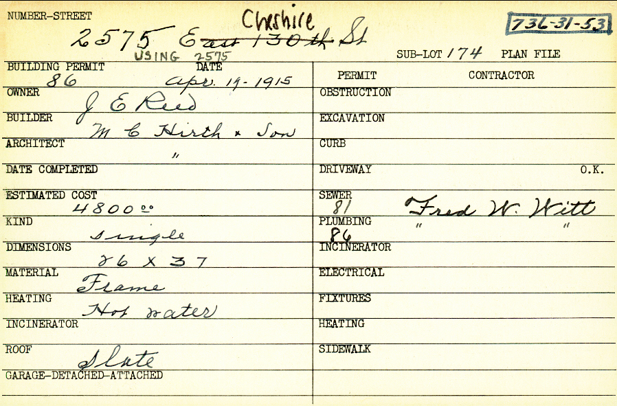 2575 Cheshire Road Shaker Heights, OH 44120 PARCEL ID: 736-31-053 Building Permit Date: 04-19-1915 Plan File Number: 0 Neighborhood: Boulevard Owner: Reed, J. E. Builder: M. C. Hirth and Son Architect: M. C. Hirth and Son Estimated Cost: 4800 Kind: Single, Single Residence or Dwelling Material: Frame Heating: Hot Water Roof: Slate Card Available: yes |