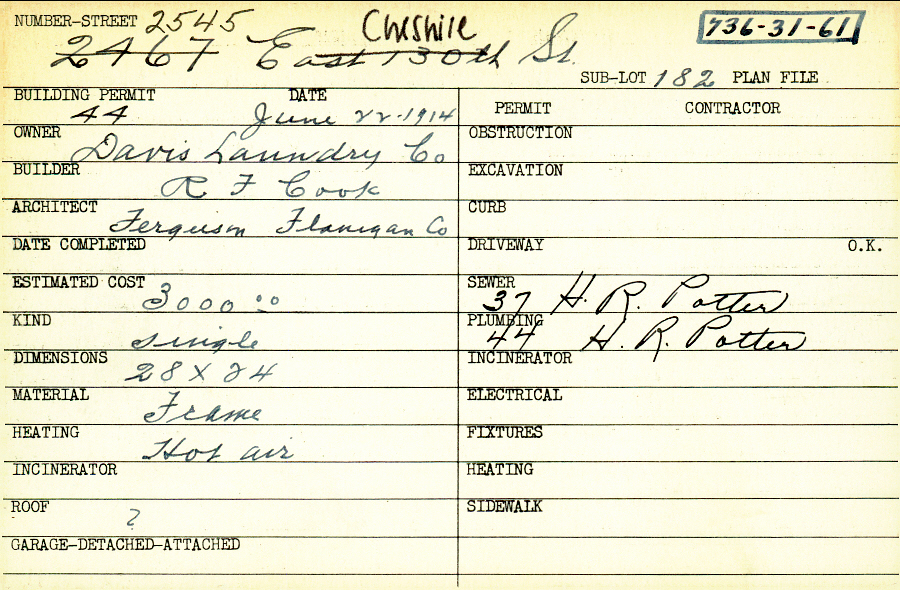2545 Cheshire Road Shaker Heights, OH 44120 PARCEL ID: 736-31-061 Building Permit Date: 06-22-1914 Plan File Number: 0 Neighborhood: Boulevard Owner: Davis Laundry Company Builder: Cook, R. F. Architect: Ferguson Flanigan Company Estimated Cost: 3000 Kind: Single, Single Residence or Dwelling Material: Frame Heating: Hot Air |