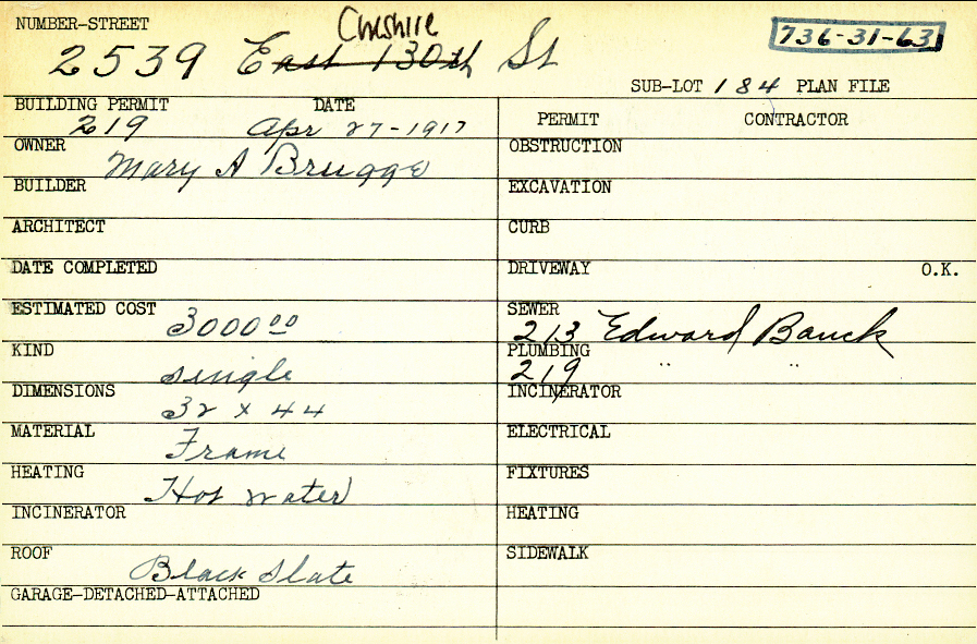 2539 Cheshire Road Shaker Heights, OH 44120 PARCEL ID: 736-31-063 Building Permit Date: 04-27-1917 Plan File Number: 0 Neighborhood: Boulevard Owner: Brugge, Mary, A. Estimated Cost: 3000 Kind: Single, Single Residence or Dwelling Material: Frame Heating: Hot Water Roof: Slate Card Available: yes |