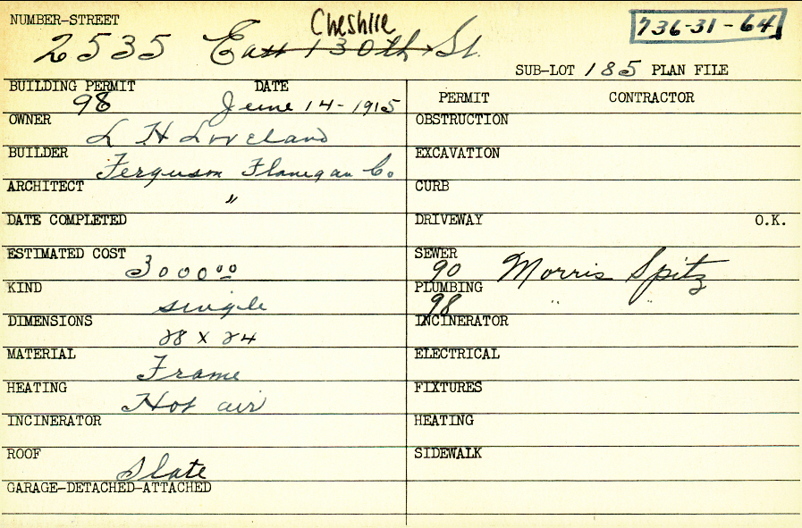 2535 Cheshire Road Shaker Heights, OH 44120 PARCEL ID: 736-31-064 Building Permit Date: 06-14-1915 Owner: Loveland, L. H. Builder: Ferguson Flanigan Company Architect: Ferguson Flanigan Company Estimated Cost: 3000 Kind: Single, Single Residence or Dwelling Material: Frame Heating: Hot Air Roof: Slate Blueprints: no blueprints on microfilm |