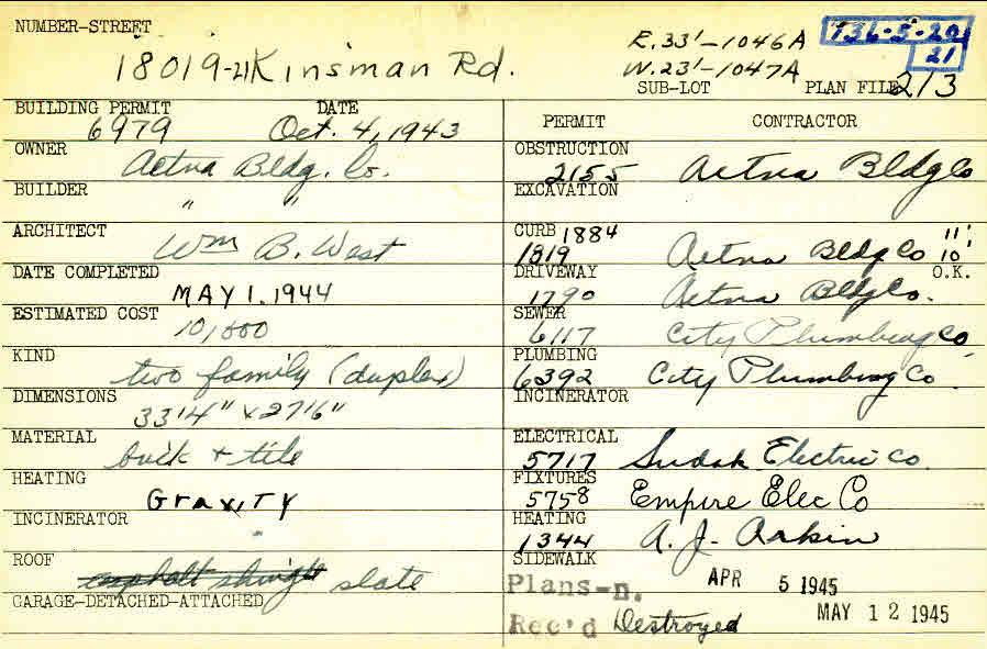 18019 Chagrin Boulevard Shaker Heights, OH 44122 PARCEL ID: 736-05-020 Building Permit Date: 10-04-1943 Plan File Number: 213, 9186 Microfilm Roll: Roll#102 Neighborhood: Lomond Owner: Aetna Building Company Builder: Aetna Building Company Architect: West, William B. Estimated Cost: 10000 Date Completed: 05-01-1944 Kind: Duplex or Two-Family Material: Brick and Tile Heating: Gravity System Roof: Slate |
