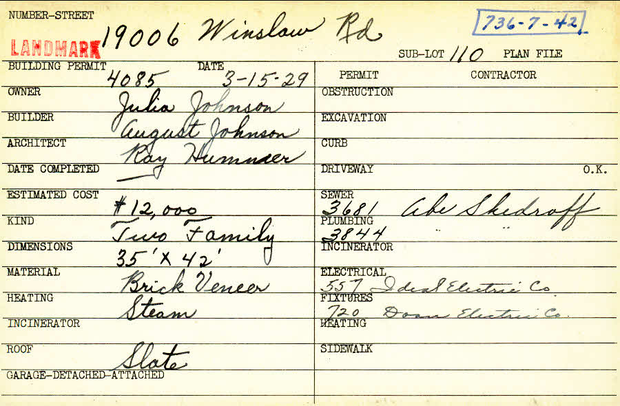 19006 Winslow Road Shaker Heights, OH 44122 PARCEL ID: 736-07-042 Building Permit Date: 03-15-1929 Plan File Number: 0 Neighborhood: Sussex Owner: Johnson, Julia Builder: Johnson, August Architect: Hummer, Ray Estimated Cost: 12000 Kind: Duplex or Two-Family Material: Brick Veneer Heating: Steam Roof: Slate  |