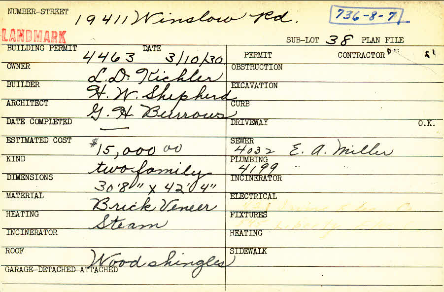 19411 Winslow Road Shaker Heights, OH 44122 PARCEL ID: 736-08-007 Building Permit Date: 03-10-1930 Plan File Number: 0 Neighborhood: Sussex Owner: Kichler, L. D. Builder: Shepherd, H. W. Architect: Burrows, G. H. Estimated Cost: 15000 Kind: Duplex or Two-Family Material: Brick Veneer Heating: Steam Roof: Wood Shingle  |