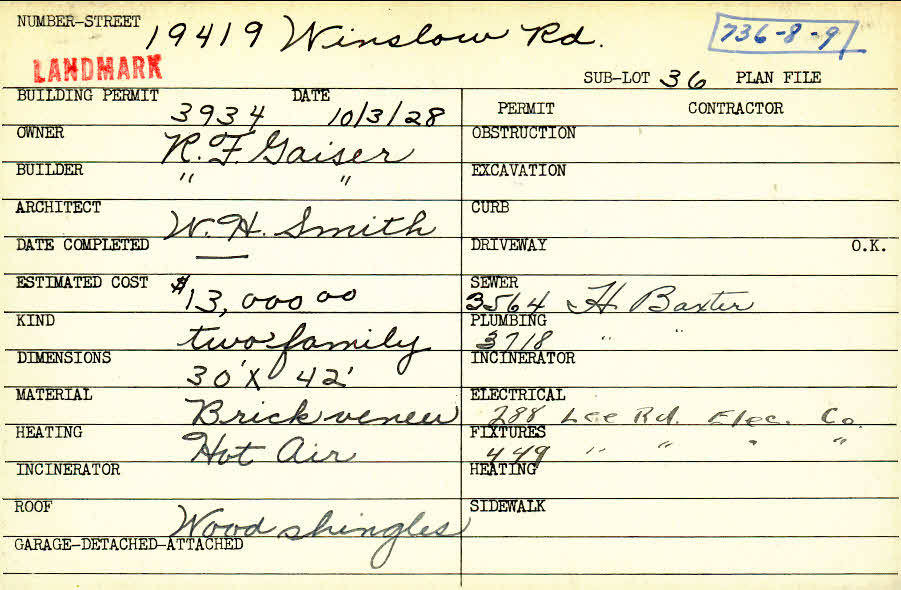 19419 Winslow Road Shaker Heights, OH 44122 PARCEL ID: 736-08-009 Building Permit Date: 10-03-1928 Plan File Number: 0 Neighborhood: Sussex Owner: Gaiser, R. F. Builder: Gaiser, R. F. Architect: Smith, W. H. Estimated Cost: 13000 Kind: Duplex or Two-Family Material: Brick Veneer Heating: Hot Air Roof: Wood Shingle  |
