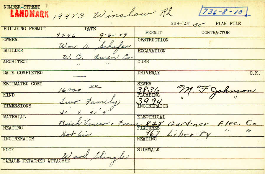 19423 Winslow Road Shaker Heights, OH 44122 PARCEL ID: 736-08-010 Building Permit Date: 09-06-1929 Plan File Number: 0 Neighborhood: Sussex Owner: Schafer, William A. Builder: W. C. Owen Company Architect: W. C. Owen Company Estimated Cost: 16000 Kind: Duplex or Two-Family Material: Brick Veneer and Frame Heating: Hot Air Roof: Wood Shingle  |