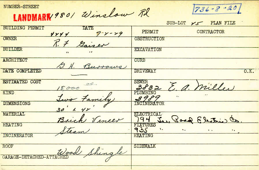 19801 Winslow Road Shaker Heights, OH 44122 PARCEL ID: 736-08-020 Building Permit Date: 07-02-1929 Plan File Number: 5042 Microfilm Roll: Roll#69 Neighborhood: Sussex Owner: Gaiser, R. F. Builder: Gaiser, R. F. Architect: Burrows, G. H. Estimated Cost: 18000 Kind: Duplex or Two-Family Material: Brick Veneer Heating: Steam Roof: Wood Shingle |