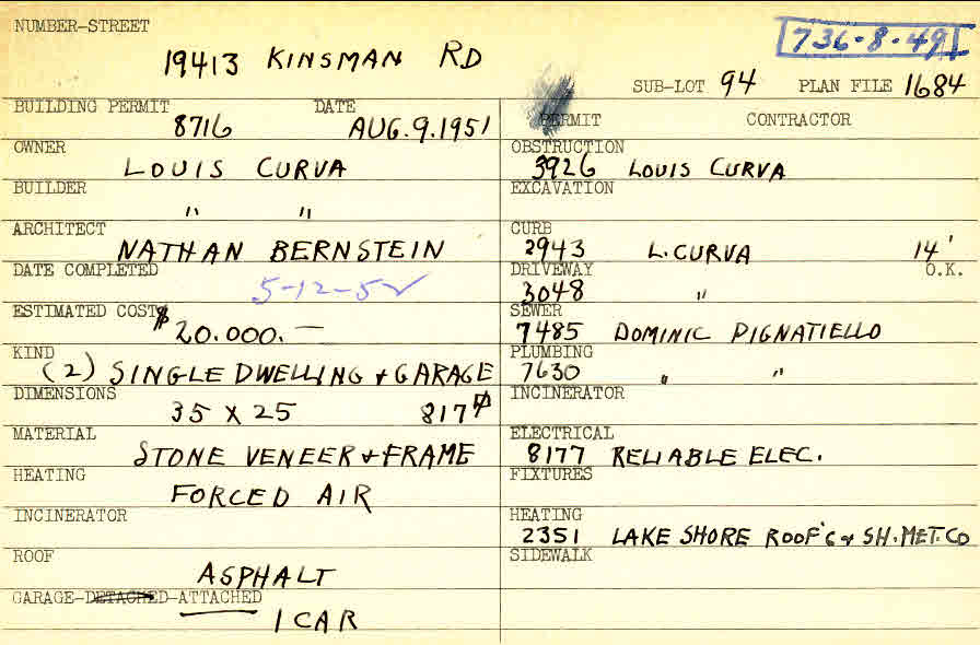 19413 Chagrin Boulevard Shaker Heights, OH 44122 PARCEL ID: 736-08-049 Building Permit Date: 08-09-1951 Plan File Number: 1684 all scanned Microfilm Roll: Roll026 Neighborhood: Sussex Owner: Curva, Louis Builder: Curva, Louis Architect: Bernstein, Nathan Estimated Cost: 20000 Date Completed: 05-12-1952 Kind: Single Dwelling and Garage (2) Material: Stone Veneer and Frame Heating: Forced Air Roof: Asphalt Garage: attached |