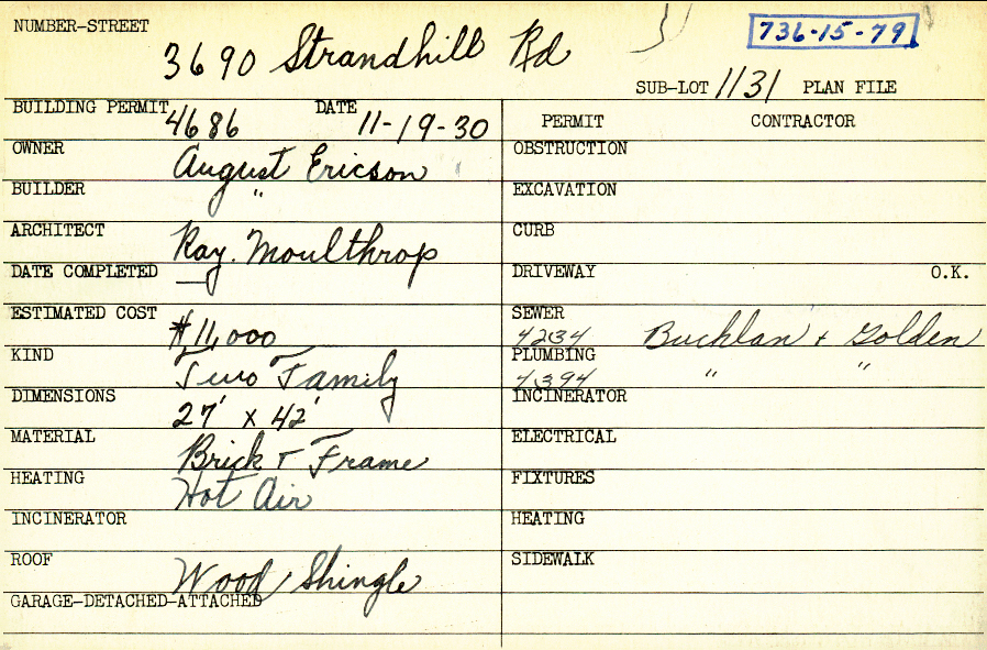 3690 Strandhill Road Shaker Heights, OH 44122 PARCEL ID: 736-15-079 Building Permit Date: 11-19-1930 Plan File Number: 0 Neighborhood: Lomond Owner: Ericson, August Builder: Ericson, August Architect: Moulthrop, Ray Estimated Cost: 11000 Kind: Duplex or Two-Family Material: Brick and Frame Heating: Hot Air Roof: Wood Shingle Card Available: yes |