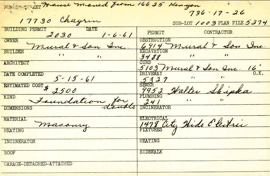 17730 Chagrin Boulevard Shaker Heights, OH 44122 PARCEL ID: 736-17-026 Building Permit Date: 01-06-1961 Plan File Number: 5274 Neighborhood: Lomond Owner: Mural and Son Inc. Builder: Mural and Son Inc. Estimated Cost: 2500 Date Completed: 05-15-1961 Material: Masonry |