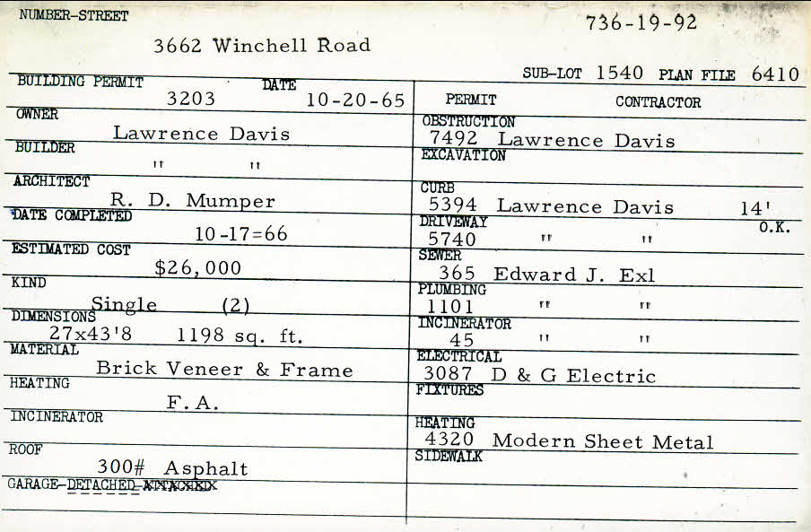3662 Winchell Road Shaker Heights, OH 44122 PARCEL ID: 736-19-092 Building Permit Date: 10-20-1965 Plan File Number: 6410 Microfilm Roll: Roll#85 Neighborhood: Lomond Owner: Davis, Lawrence Builder: Davis, Lawrence Architect: Mumper, R. D. Estimated Cost: 26000 Date Completed: 10-17-1966 Kind: Single, Single Residence or Dwelling (2) Material: Brick Veneer and Frame Heating: Forced Air Roof: 300# Min Asphalt Garage: detached |