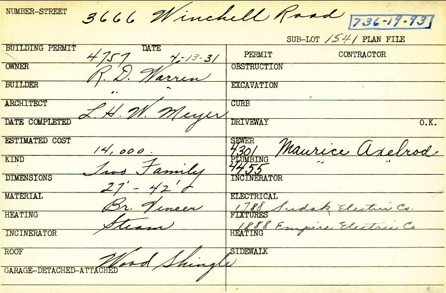 3666 Winchell Road Shaker Heights, OH 44122 PARCEL ID: 736-19-093 Building Permit Date: 04-13-1931 Plan File Number: 4383 all scanned Microfilm Roll: Roll062 Neighborhood: Lomond Owner: Warren, R. D. Builder: Warren, R. D. Architect: Meyer, L. H. W. Estimated Cost: 14000 Kind: Duplex or Two-Family Material: Brick Veneer Heating: Steam Roof: Wood Shingle |