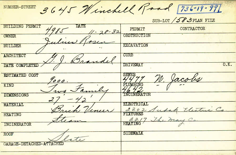 3645 Winchell Road Shaker Heights, OH 44122 PARCEL ID: 736-19-099 Building Permit Date: 11-28-1932 Plan File Number: 1087 all scanned Microfilm Roll: Roll013 Neighborhood: Lomond Owner: Rosen, Julius Builder: Rosen, Julius Architect: Brandel, G. J. Estimated Cost: 9000 Kind: Duplex or Two-Family Material: Brick Veneer Heating: Steam Roof: Slate |