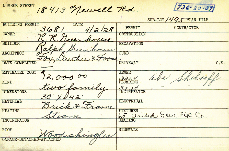 18413 Newell Road Shaker Heights, OH 44122 PARCEL ID: 736-20-039 Building Permit Date: 04-02-1928 Plan File Number: 5234 Microfilm Roll: Roll#72 Neighborhood: Lomond Owner: Greenhouse, R. R. Builder: Greenhouse, Ralph Architect: Fox, Duthie and Foose Estimated Cost: 12000 Kind: Duplex or Two-Family Material: Brick and Frame Heating: Steam Roof: Wood Shingle |