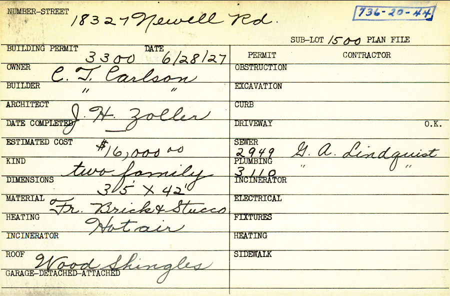 18327 Newell Road Shaker Heights, OH 44122 PARCEL ID: 736-20-044 Building Permit Date: 06-28-1927 Plan File Number: 3798 Microfilm Roll: Roll#56 Neighborhood: Lomond Owner: Carlson, C. T. Builder: Carlson, C. T. Architect: Zoller, J. H. Estimated Cost: 16000 Kind: Duplex or Two-Family Material: Frame Brick and Stucco Heating: Hot Air Roof: Wood Shingle |