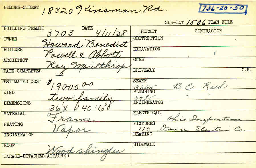 18320 Chagrin Boulevard Shaker Heights, OH 44122 PARCEL ID: 736-20-050 Building Permit Date: 04-11-1928 Plan File Number: 0 Neighborhood: Lomond Owner: Benedict, Howard Builder: Powell and Abbott Architect: Moulthrop, Ray Estimated Cost: 19000 Kind: Duplex or Two-Family Material: Frame Heating: Vapor Roof: Wood Shingle Card Available: yes |