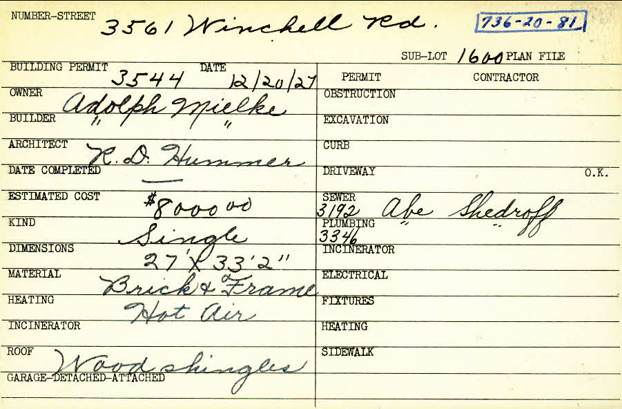 3561 Winchell Road Shaker Heights, OH 44122 PARCEL ID: 736-20-081 Building Permit Date: 12-20-1927 Plan File Number: 0 Neighborhood: Lomond Owner: Mielke, Adolph Builder: Mielke, Adolph Architect: Hummer, R. D. Estimated Cost: 8000 Kind: Single, Single Residence or Dwelling Material: Brick and Frame Heating: Hot Air Roof: Wood Shingle Card Available: yes |