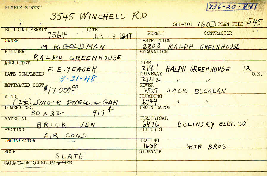 3545 Winchell Road Shaker Heights, OH 44122 PARCEL ID: 736-20-084 Building Permit Date: 06-09-1947 Plan File Number: 545 all scanned Microfilm Roll: Roll007 Neighborhood: Lomond Owner: Goldman, M. R. Builder: Greenhouse, Ralph Architect: Yeager, Floyd E. Estimated Cost: 17000 Date Completed: 03-31-1948 Kind: Single 2-1/2 Material: Brick Veneer Heating: Air Conditioned Roof: Slate Garage: detached |