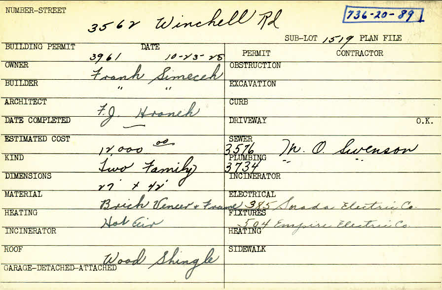 3562 Winchell Road Shaker Heights, OH 44122 PARCEL ID: 736-20-089 Building Permit Date: 10-23-1925 Plan File Number: 6581 Microfilm Roll: Roll#86 Neighborhood: Lomond Owner: Simecek, Frank Builder: Simecek, Frank Architect: Hronek, F. J. Estimated Cost: 12000 Kind: Duplex or Two-Family Material: Brick Veneer and Frame Heating: Hot Air Roof: Wood Shingle |