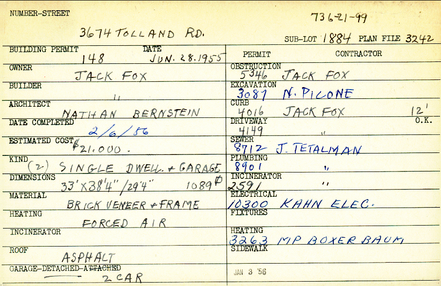 3674 Tolland Road Shaker Heights, OH 44122 PARCEL ID: 736-21-099 Building Permit Date: 06-28-1955 Plan File Number: 3242 Microfilm Roll: Roll#47 Neighborhood: Sussex Owner: Fox, Jack Builder: Fox, Jack Architect: Bernstein, Nathan Estimated Cost: 21000 Date Completed: 02-06-1956 Kind: Single Dwelling and Garage (2) Material: Brick Veneer and Frame Heating: Forced Air Roof: Asphalt Garage: detached 2 car |