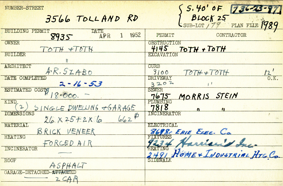 3566 Tolland Road Shaker Heights, OH 44122 PARCEL ID: 736-23-097 Building Permit Date: 04-01-1952 Plan File Number: 1989 Microfilm Roll: Roll#30 Neighborhood: Sussex Owner: Toth and Toth Builder: Toth and Toth Architect: Szabo, A. R. Estimated Cost: 18000 Date Completed: 02-16-1953 Kind: Single Dwelling and Garage (2) Material: Brick Veneer Heating: Forced Air Roof: Asphalt Garage: detached 2 car |