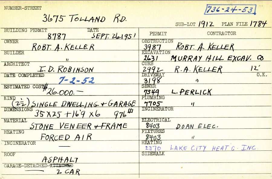 3675 Tolland Road Shaker Heights, OH 44122 PARCEL ID: 736-24-053 Building Permit Date: 09-26-1951 Plan File Number: 1784 scanned, 5816, 10242 Microfilm Roll: Roll027, Roll#79, NewRoll#3 Neighborhood: Sussex Owner: Keller, Robert A. Builder: Keller, Robert A. Architect: Robinson, I. D. Estimated Cost: 26000 Date Completed: 07-02-1952 Kind: Single 2-1/2 Material: Stone Veneer and Frame Heating: Forced Air Roof: Asphalt Garage: detached 2 car |
