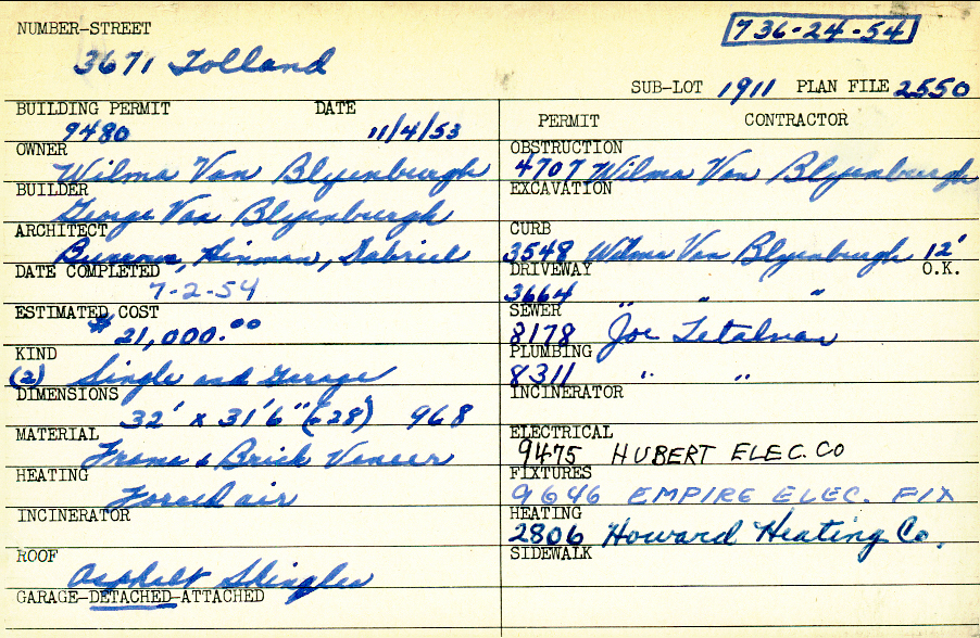 3671 Tolland Road Shaker Heights, OH 44122 PARCEL ID: 736-24-054 Building Permit Date: 11-04-1953 Plan File Number: 2550 Microfilm Roll: Roll #36 Neighborhood: Sussex Owner: Van Blyenburgh, Wilma Builder: Van Blyenburgh, George Architect: Burrows, Hinman, Gabriel Estimated Cost: 21000 Date Completed: 07-02-1954 Kind: Single Dwelling and Garage (2) Material: Frame and Brick Veneer Heating: Forced Air Roof: Asphalt Shingles Garage: detached |
