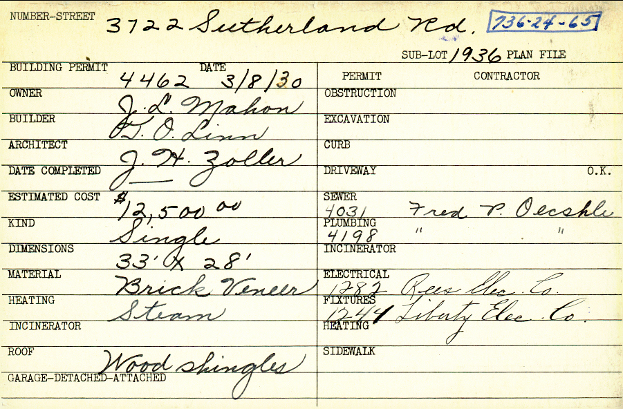 3722 Sutherland Road Shaker Heights, OH 44122 PARCEL ID: 736-24-065 Building Permit Date: 03-08-1930 Plan File Number: 10551 Microfilm Roll: NewRoll#4 Neighborhood: Sussex Owner: Mahon, J. L. Builder: Linn, T. O. Architect: Zoller, J. H. Estimated Cost: 12500 Kind: Single, Single Residence or Dwelling Material: Brick Veneer Heating: Steam Roof: Wood Shingle |
