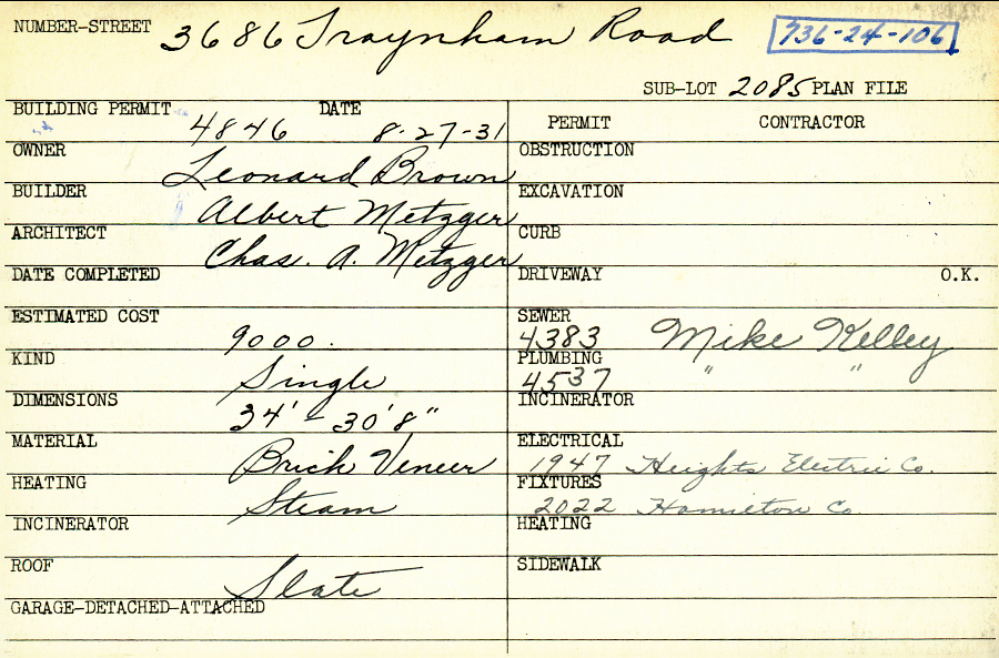 3686 Traynham Road Shaker Heights, OH 44122 PARCEL ID: 736-24-106 Building Permit Date: 08-27-1931 Plan File Number: 0 Neighborhood: Sussex Owner: Brown, Leonard Builder: Metzger, Albert Architect: Metzger, Charles A. Estimated Cost: 9000 Kind: Single, Single Residence or Dwelling Material: Brick Veneer Heating: Steam Roof: Slate Card Available: yes |