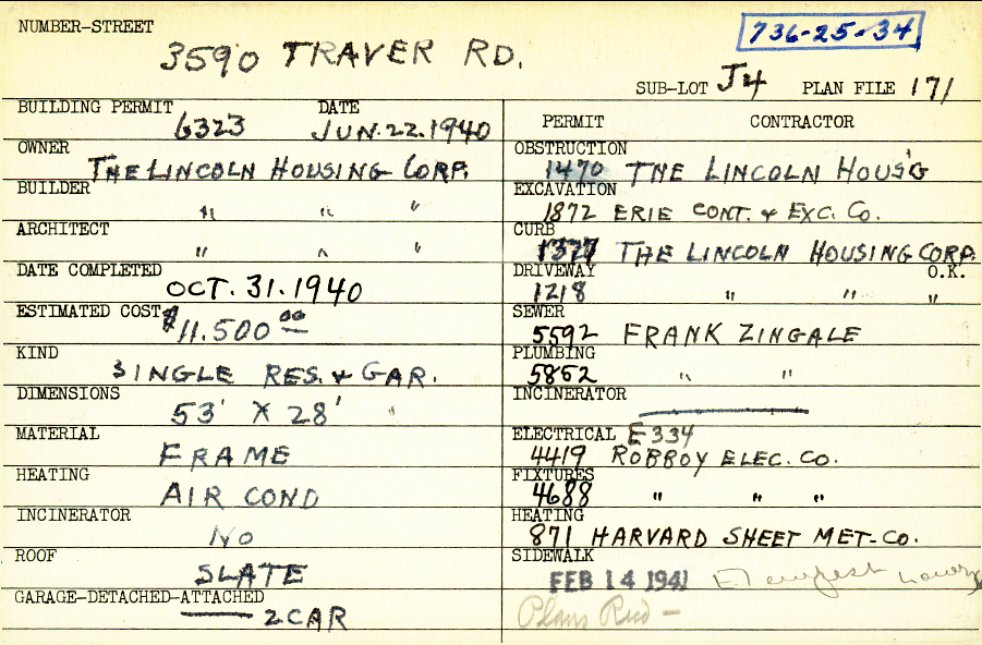 3590 Traver Road Shaker Heights, OH 44122 PARCEL ID: 736-25-034 Building Permit Date: 06-22-1940 Plan File Number: 171, 7784, 10056, 10100 Microfilm Roll: Roll#94, Roll#105, NewRoll#2 Neighborhood: Sussex Owner: The Lincoln Housing Corporation Builder: The Lincoln Housing Corporation Architect: The Lincoln Housing Corporation Estimated Cost: 11500 Date Completed: 10-31-1940 Kind: Single Dwelling and Garage Material: Frame Heating: Air Conditioned Roof: Slate Garage: attached 2 car |