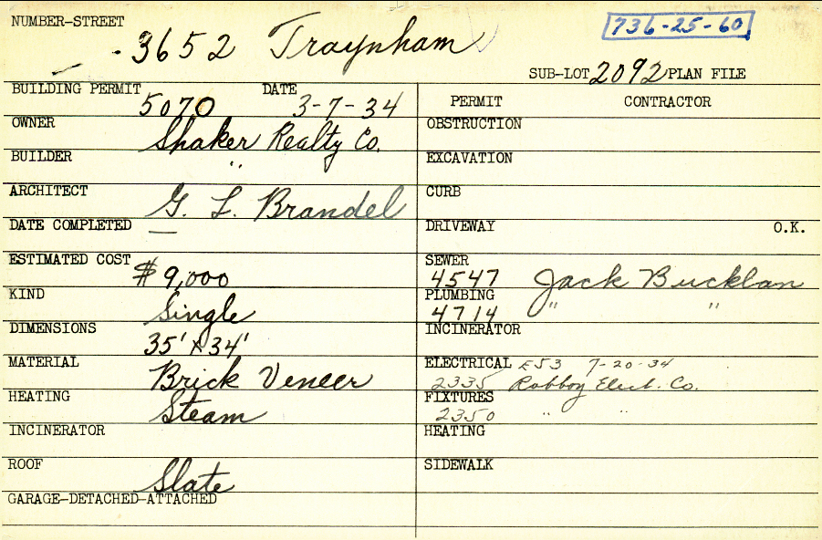 3652 Traynham Road Shaker Heights, OH 44122 PARCEL ID: 736-25-060 Building Permit Date: 03-07-1934 Plan File Number: 7423 Microfilm Roll: Roll#92 Neighborhood: Sussex Owner: Shaker Realty Company Builder: Shaker Realty Company Architect: Brandel, G. L. Estimated Cost: 9000 Kind: Single, Single Residence or Dwelling Material: Brick Veneer Heating: Steam Roof: Slate |