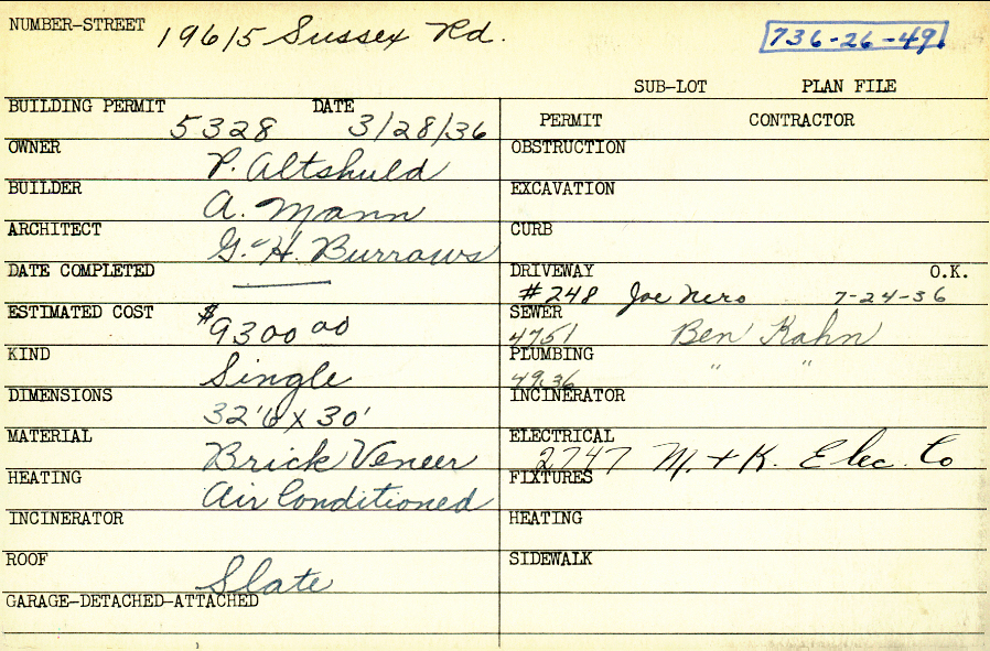 19615 Sussex Road Shaker Heights, OH 44122 PARCEL ID: 736-26-049 Building Permit Date: 03-28-1936 Plan File Number: 0 Neighborhood: Sussex Owner: Altshuld, P. Builder: Mann, A. Architect: Burrows, G. H. Estimated Cost: 9300 Kind: Single, Single Residence or Dwelling Material: Brick Veneer Heating: Air Conditioned Roof: Slate |