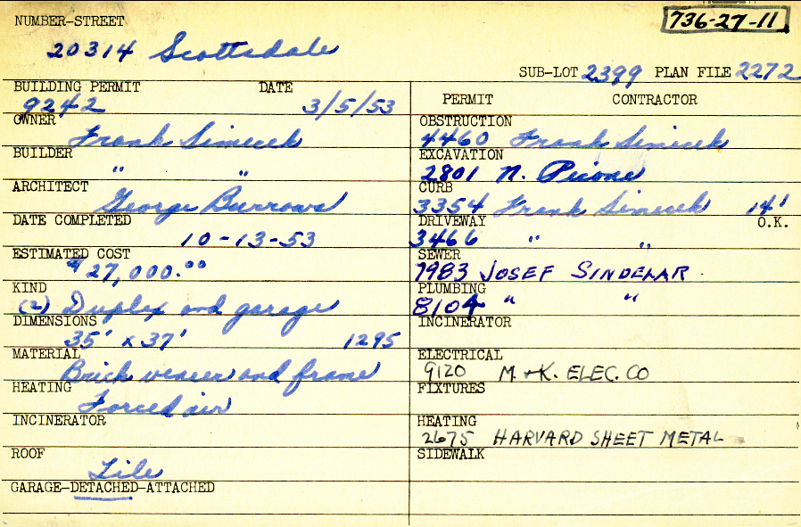 20316 Scottsdale Boulevard Shaker Heights, OH 44122 PARCEL ID: 736-27-011 Building Permit Date: 03-05-1953 Plan File Number: 2272 Neighborhood: Sussex Owner: Simecek, Frank Builder: Simecek, Frank Architect: Burrows, George Estimated Cost: 27000 Date Completed: 10-13-1953 Kind: Duplex or Two-Family and Garage Material: Brick Veneer and Frame Heating: Forced Air Roof: Tile Garage: detached |