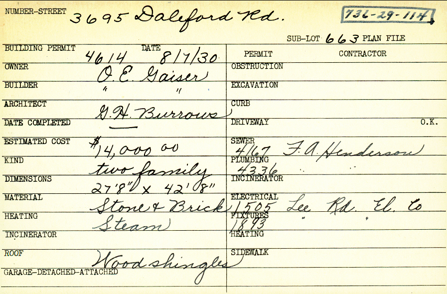 3695 Daleford Road Shaker Heights, OH 44120 PARCEL ID: 736-29-114 Building Permit Date: 08-07-1930 Plan File Number: 0 Neighborhood: Lomond Owner: Gaiser, O. E Builder: Gaiser, O. E. Architect: Burrows, G. H. Estimated Cost: 14000 Kind: Duplex or Two-Family Material: Stone and Brick Heating: Steam Roof: Wood Shingle |